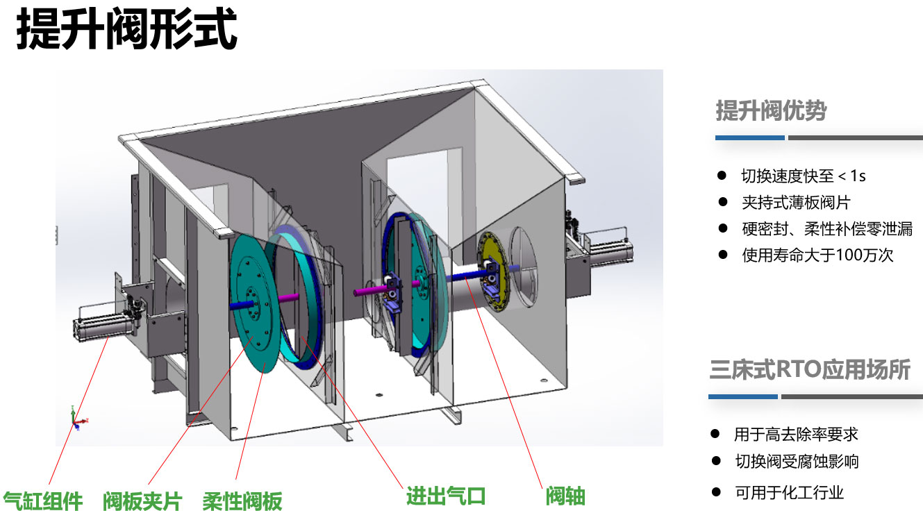• RTO 具有自动控制提升阀的功能。这些阀门用于空气流动方向的切换。